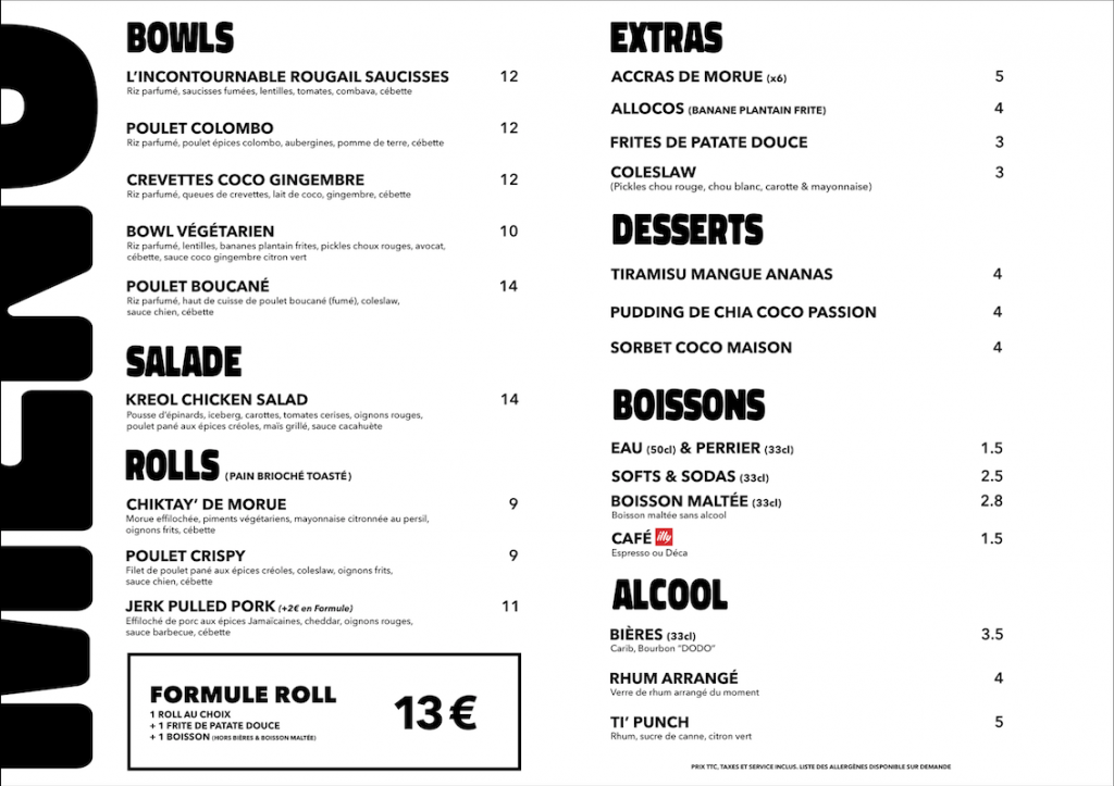 PRIX TTC, TAXES ET SERVICE INCLUS. LISTE DES ALLERGÈNES DISPONIBLE SUR DEMANDE.